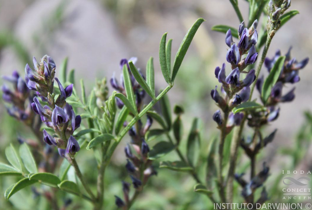 Sufrútice glabro, glanduloso. Raíz principal axonomorfa, leñosa; rizomas largos, pro¬fundos, cubiertos por catáfilas. Tallos hasta 50 cm o más, verdes a castaño-rojizos. Ho¬jas alternas, con 3-7 pares de folíolos opuestos; raquis con mechones de pelos carnosos en la inserción de los peciólulos; estípulas de 2,5-3,5 mm, ovadas a triangulares, frecuen¬temente ciliadas en el margen, caedizas; folíolos de 5-30 (3E>) x 2-10 (15) mm, el termi¬nal generalmente mayor, elípticos a obovados, emarginados o mucronados, 1-nervios u oscuramente pinnatinervios. Racimos de 2-15 cm, al principio compactos, luego laxos. Flores de 7-8 mm, azules o violáceas, brevemente pediceladas; bráctea de 2-4 mm, lan-ceolado-acuminada, hirsuta, caediza. Cáliz de 3,5-5 mm, glanduloso-pubescente; dientes triangulares, los superiores ± soldados, los inferiores hasta 3 mm. Vexilo de 6,5- 7,5 x 4-5 mm, anchamente elíptico, rara vez ovado, uña breve, cóncava; limbo de las alas de 4-5 x 1,5-2 mm, elíptico, obtuso, uña breve; limbo de la quilla hasta 4 mm, agudo, uña de 1,5-2 mm. Ovario de 2-4 x 0,6-1,2 mm, elipsoide, glanduloso, 3-4-ovulado; estilo de 2,5-3 mm, recto. Legumbre de 10-20 x 4-7 mm, 1-4 seminada, comprimida, a veces toru-losa, mucronada, glandulosa, castaña. Semillas de 4-5 x 2,5-3,5 mm, ovoides
