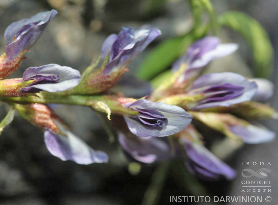 Sufrútice glabro, glanduloso. Raíz principal axonomorfa, leñosa; rizomas largos, pro¬fundos, cubiertos por catáfilas. Tallos hasta 50 cm o más, verdes a castaño-rojizos. Ho¬jas alternas, con 3-7 pares de folíolos opuestos; raquis con mechones de pelos carnosos en la inserción de los peciólulos; estípulas de 2,5-3,5 mm, ovadas a triangulares, frecuen¬temente ciliadas en el margen, caedizas; folíolos de 5-30 (3E>) x 2-10 (15) mm, el termi¬nal generalmente mayor, elípticos a obovados, emarginados o mucronados, 1-nervios u oscuramente pinnatinervios. Racimos de 2-15 cm, al principio compactos, luego laxos. Flores de 7-8 mm, azules o violáceas, brevemente pediceladas; bráctea de 2-4 mm, lan-ceolado-acuminada, hirsuta, caediza. Cáliz de 3,5-5 mm, glanduloso-pubescente; dientes triangulares, los superiores ± soldados, los inferiores hasta 3 mm. Vexilo de 6,5- 7,5 x 4-5 mm, anchamente elíptico, rara vez ovado, uña breve, cóncava; limbo de las alas de 4-5 x 1,5-2 mm, elíptico, obtuso, uña breve; limbo de la quilla hasta 4 mm, agudo, uña de 1,5-2 mm. Ovario de 2-4 x 0,6-1,2 mm, elipsoide, glanduloso, 3-4-ovulado; estilo de 2,5-3 mm, recto. Legumbre de 10-20 x 4-7 mm, 1-4 seminada, comprimida, a veces toru-losa, mucronada, glandulosa, castaña. Semillas de 4-5 x 2,5-3,5 mm, ovoides
